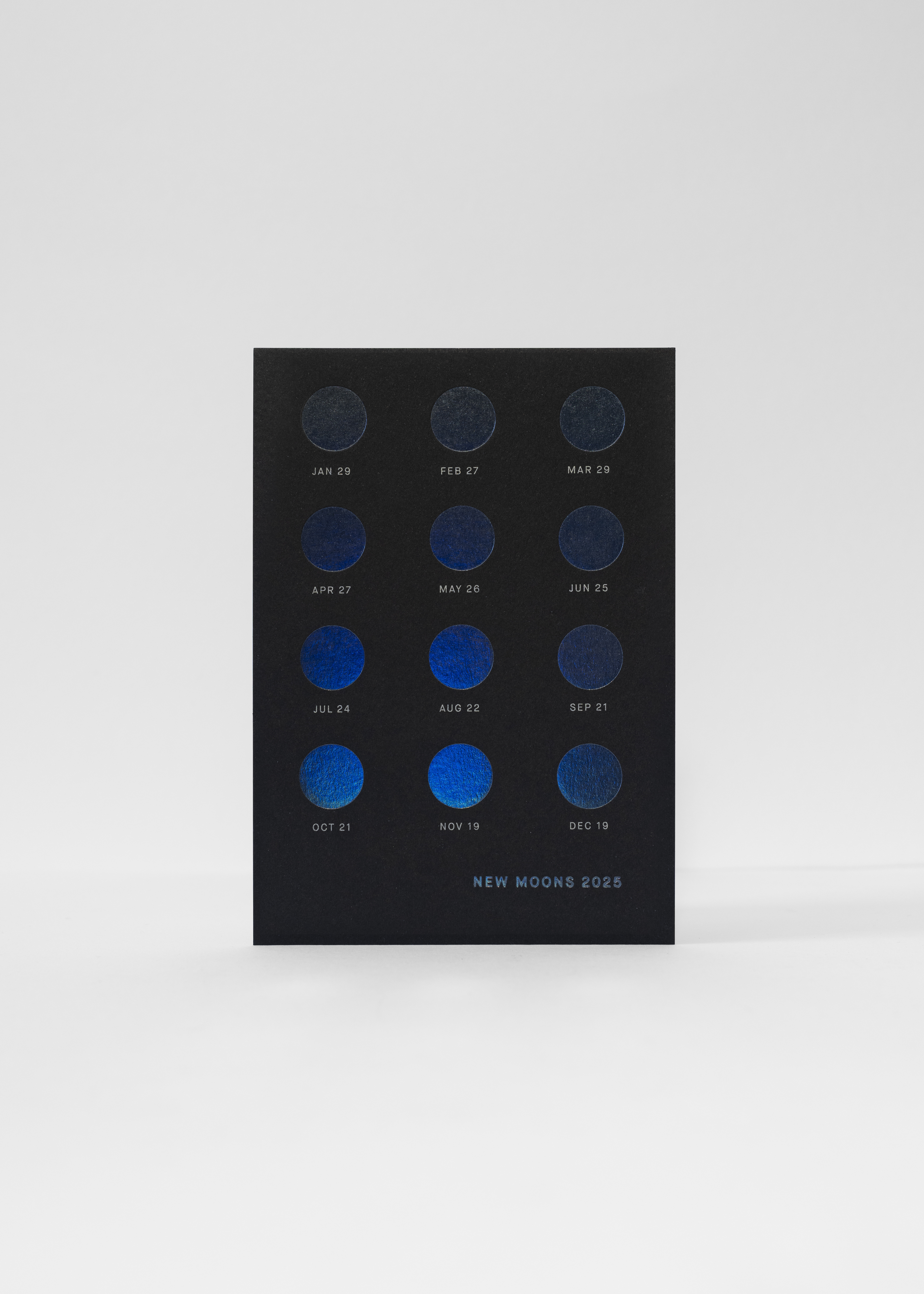 The two-sided calendar features the dates of 2025 full moons on one side, and new moons on the other side. Each full moon is accompanied by a corresponding folk name.